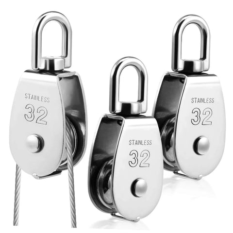The 3-piece stainless steel pulley block set is designed for heavy lifting and rope rigging across construction sites, stage rigs, and DIY projects. Each single block features a swiveling head and a bearing-supported sheave to minimize friction and ensure smooth motion when moving loads. Built to withstand indoor and outdoor use, these pulleys combine a polished stainless steel finish with durable construction for long-lasting performance in tough environments. Pack size: 3 pulleys in one set.