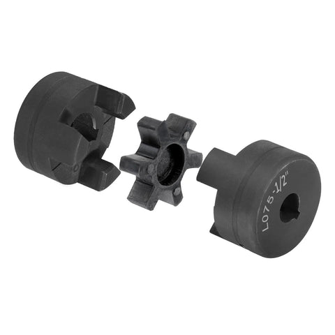 Flexible Three Piece L Jaw Coupling Set From One Half Inch To Seven Eighth Inch Bore With NBR Buna N Rubber Insert For Log Splitter And Hybrid Equipment Built Tough With HT250 Steel Shafts Set Screws And Keyways Included