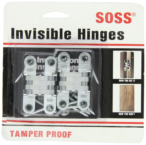 Hidden Cabinet Door Hinges For Flush Or Overlay Installations That Stay Hidden When Closed SOSS 204CUS26D Mortise Mount Invisible Hinges In Zinc Satin Chrome Finish With Four Holes Includes Wood Screws And Paper Template Opens 180 Degrees