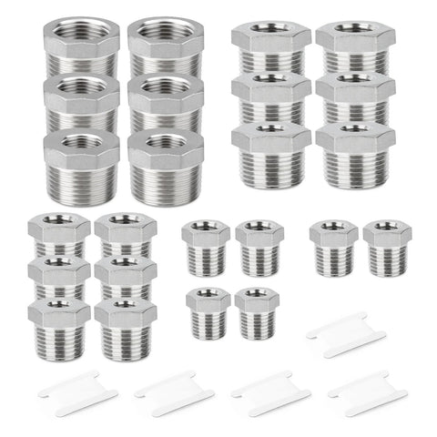 Pro Grade 24 Piece Reducer Hex Bushing Fitting Kit In 304 Stainless Steel For Pipe Thread Adapters And Fittings Includes A Full Range Of Quarter To Three Quarter Inch Reducers For Industrial Plumbing