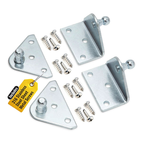 10毫米球头安装支架套装,适用于气弹簧和引擎盖,采用重型钢结构,不锈钢螺丝和锌镀层,包含两个平板支架和两个角度支架,适合弹簧引擎盖支撑和闭合活塞安装