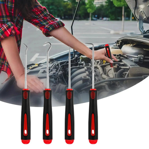 4件套汽车维修挑钩工具组,必备款,长度6.5英寸,含135度弯钩、90度钩、45度钩及锋利钻头,符合人体工学防滑手柄,专业级机械挑针,适用于油封和拉拔器拆卸,男士礼物首选