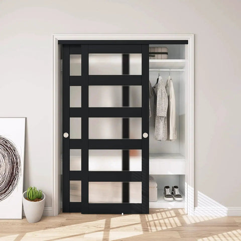 60英寸×80英寸滑动衣柜门,配5格磨砂玻璃推拉设计,含五金套件及配套饰板,预钻孔实木板,防水PVC表面,易于安装,黑色饰面