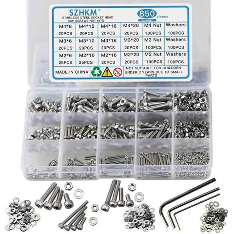 这套完整的紧固件组合包含850件公制硬件,规格为M2、M3和M4,包括螺丝、螺母和垫圈。透明收纳盒设计,非常适合电子项目、模型制作、3D打印、维修和DIY任务。