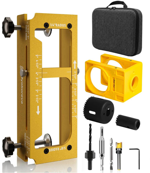 一体式门铰链夹具及锁具安装套件,配备铝合金可调榫眼模板,适用于路由器,兼容2.5至5英寸铰链及1/4英寸或5/8英寸半径和方形角,适配1 3/8英寸和1 3/4英寸门。