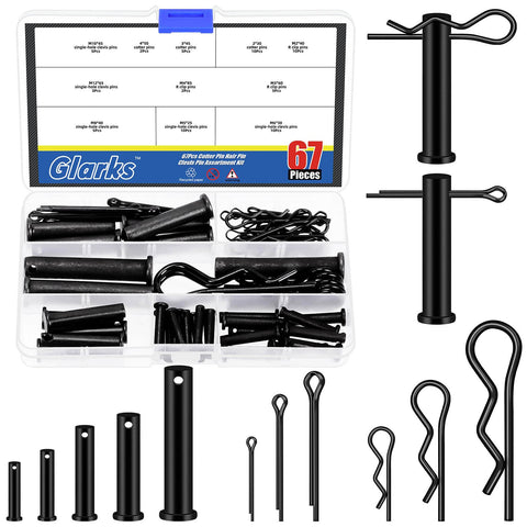 多用途开口销套装,含开口销和R型夹,11种尺寸共67件,黑色表面处理,适用于工业五金、机械、汽车及DIY项目,包括连接铰链销和键紧固件 Glarks