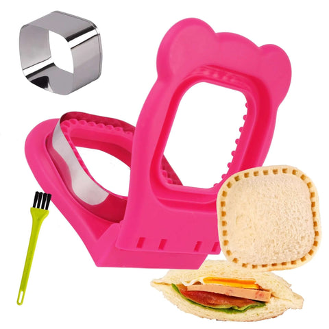 无边PB果酱三明治制作封口切割器,双面密封,锋利不锈钢切割刀,附赠防漏边缘填充切割器,玫红色方形设计,无边三明治风格DIY快速简便填充器