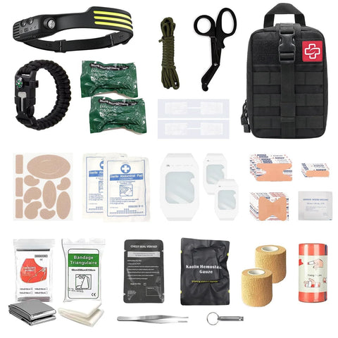 ✅ 包含止血纱布和以色列压迫绷带,快速控制出血。✅ 配备紧急伤口封闭器、胶带绷带和三角绷带,用于骨折处理。